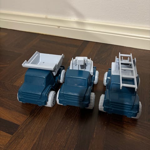 Plaston leluautot ulkoleikkeihin. Kauha-kuormaaja, kaivuri ja jonkun toisen merkin dinoauto vielä bonuksena. Leikityt mutta vielä ehjät seuraaviin leikkeihin.