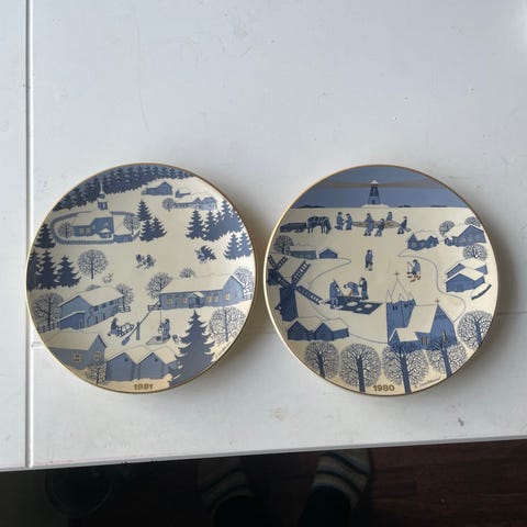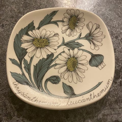 Arabia Päivänkakkara lautaset (2 kpl), jossa kukkakuvio sinisellä taustalla. Lautanen on valmistettu posliinista ja siinä on koristeena päivänkakkaroita ja muita kukkia. Design: Tove ja O. Utamainen.
