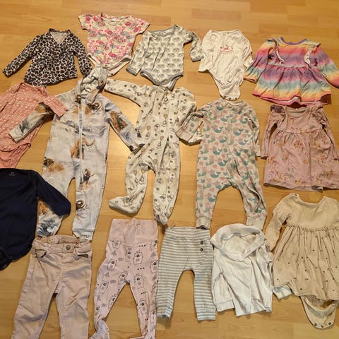 Myydään seuraavalle vaatepaketti koossa 74cm. Vaatteiden kunto enemmän käytetystä vähemmän käytettyyn. Paketissa mm.