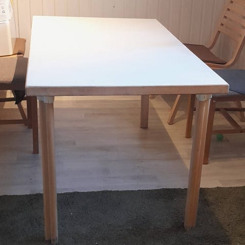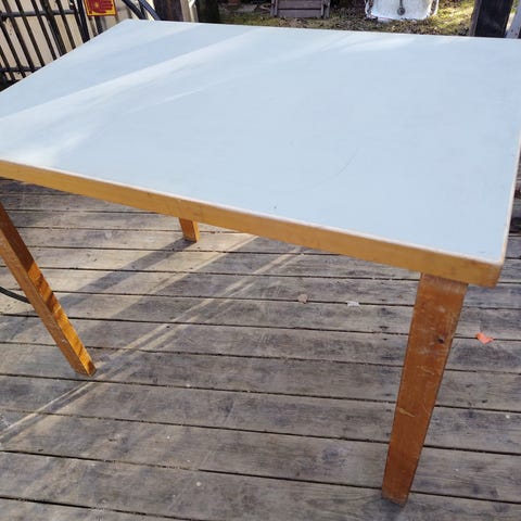 Pöydässä on kuvanmukainen kynttilän jättämä jälki. Muuten se on hyvässä kunnossa eikä näkyviä kolhuja juurikaan ole. Pöytä on vanhaa "tukevampaa mallia" eli sen paksuus on n. 45mm nykyisten 40mm levyjen sijaan.