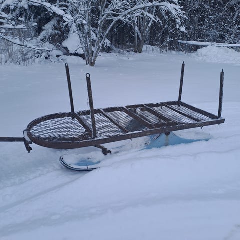 Monikäyttöinen reki kelkan perään, aisassa nytkä ja suksissa muovit, kulkee kepeästi kelkan perässä.