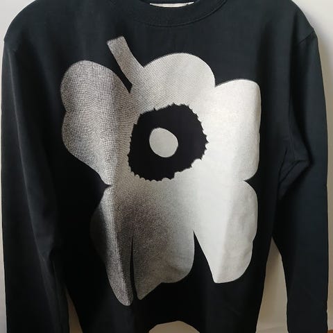 Musta t-paita valkoisella unikolla. Relaxed malli koossa S. Itse käytän M-koon yläosia niin tämä ollut sopiva. Muutamia kertoja pesty, ehkä aavistuksen haalistumaa mutta edelleen selvästi musta.