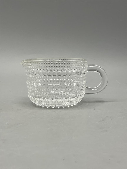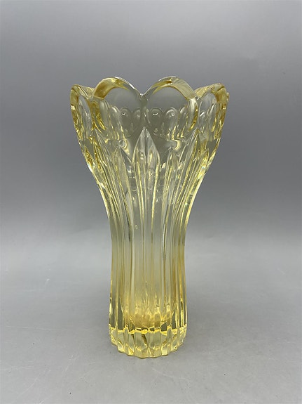 Lasinen maljakko, jossa on kukkamainen muotoilu ja huurrettu pinta.