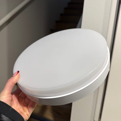 Myydään pieni pyöreä valaisin, seinälle tai kattoon. Koko valaisimen halkaisija 17cm, valo-osuus 12cm.