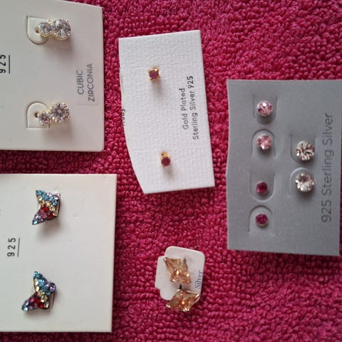 Hopeisia/kannat hopeaa (alimmat punaiset harjoituskorvikset muuta materiaalia) nappikorviksia. Suurin osa käyttämättömiä. Yhteensä 21 paria, yhteishinta 40e eli 2 e kpl. Yksittäin tai pienemmissä erissä ostettuna 6e/ kpl. Nouto savonlinnasta tai lähetys mieluiten ärrä kuplapussina lähimmälle r-kioskille 6e. Posti xxs paketti seurantakoodilla postilaatikkoon 6.90. Pyydettäessä myös toridiili. Mmm. Myynnissä myös muita koruja, halutessasi katso myös ne.
