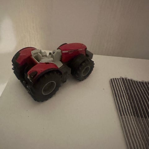 r Massey Ferguson lelu-traktori, valmistettu muovista. Värit punainen ja musta. Lelu on tarkoitettu lasten käyttöön ja mallintaa maataloustraktoria.