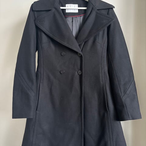 Kaunislinjainen villakangastakki, laadukkaasta materiaalista (villa, kashmir, polyamidi). Leveä helma ja napakka yläosa/hihat. Pituus 85 cm.