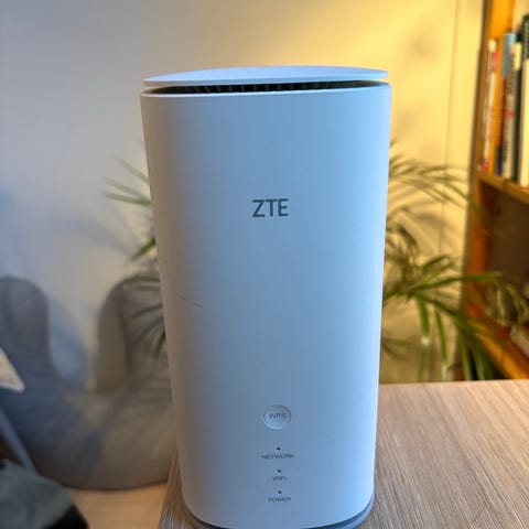 ZTE Reititin valkoisella värillä. Laite on suunniteltu langattomaan verkon jakamiseen ja sisältää useita liitäntöjä verkkokaapeleille. Sopii kotikäyttöön tai pieniin toimistoihin.