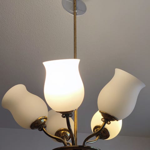 Viidellä maitolasisilla isoilla kuvuilla, leimattu, korkeus n 82cm, lampun kanta E27, toimii moitteetta, ehjä ja siisti