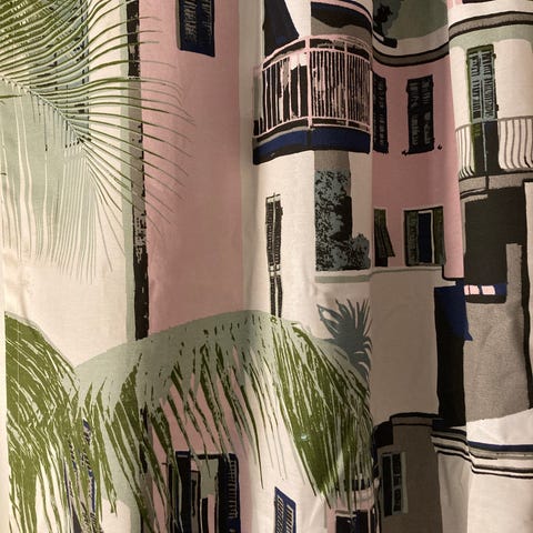 Näyttävän verhon materiaali on 83% puuvillaa ja 17% polyesteriä.