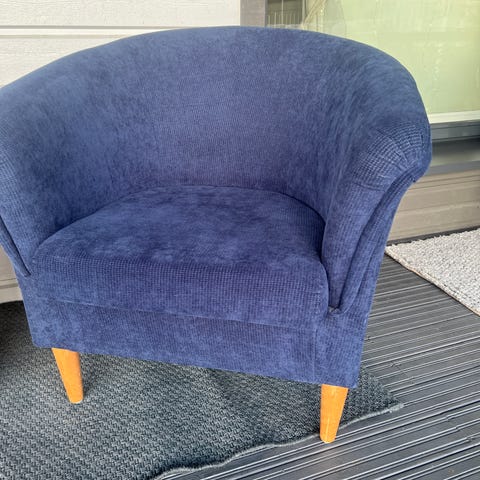 Kermanvalkoinen nahkanojatuoli. Istuinosa pyörii. Jalka mustaa metallia. Tässä on jonkinlainen kallistusmekanismi, vipu jalassa. Sen toimivuudesta ei tietoa. Todella mukava istua. Tuoli on melko painava.