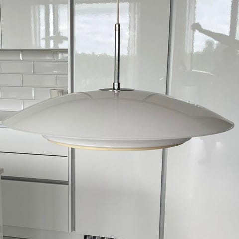 45 x 45cm, muoviympyrät voi irrottaa ja pestä. Ketju lyhennetty, nyt kattotason ja valaisimen välille jää 38cm. Täysin toimiva, polttimot sis. hintaan.