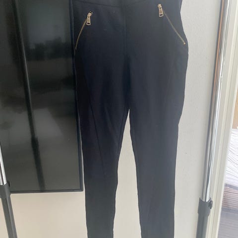 GUESS mustat naisten housut, koko M. Housut ovat muotoilultaan yksinkertaiset ja niissä on koristeellisia niittejä taskuissa. Materiaalista ei ole tarkempaa tietoa. Soveltuvat monipuoliseen käyttöön.