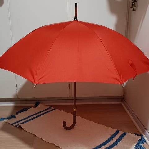 Avaamattomat sateenvarjot. Ostettu häitä varten mutta eivät tulleet käyttöön