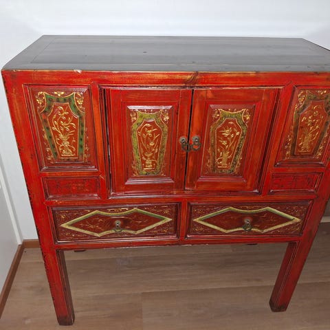 Hyväkuntoinen punainen kiinakaappi.