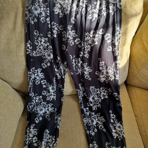 Kokomerkintä L, menevät M-L koolle. Joustovyötärö, lahkeissa sivuilla halkiot.