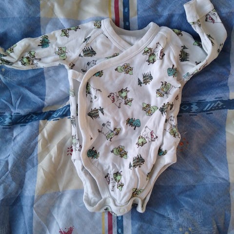 Paljon käytetyt muumibodyt. Ehjät mutta toisessa nukkaa ja toisessa aavistus kellastumaa kauluksessa - ei olla koitettu tahranpoistoa