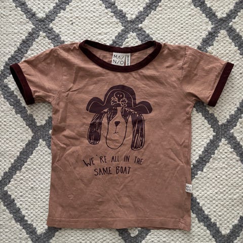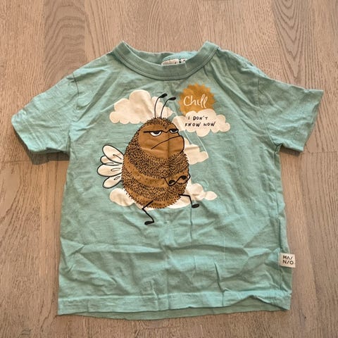 Mainio lasten T-paita, koko 104, väriltään sininen. Unisex-malli, sopii sekä tytöille että pojille. Löytyy pieni tahra (viimeisessä kuvassa).
