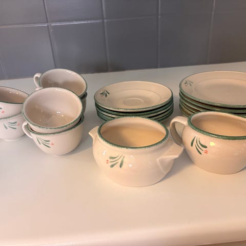 Myydään käyttämätön Pentikin kahviastiasto, jossa 6kpl kahvikuppeja ja niiden alulautasia + yksi isompi tarjoilulautanen. Väriltään beige
