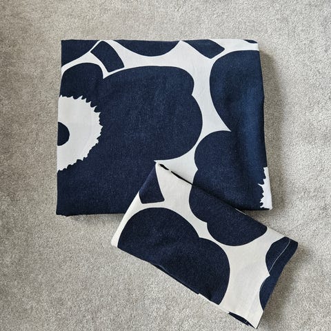 Kerran käytössä olleet Marimekon unikko pussilakanat yhden hengen sänkyyn.
