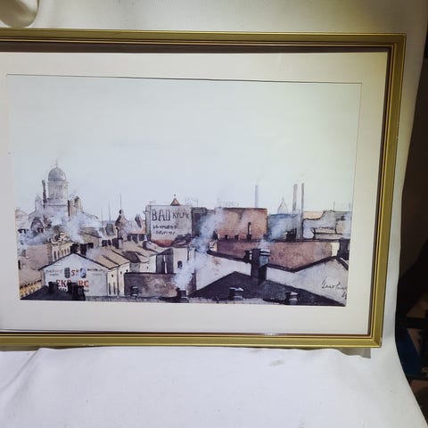 Kuvien mukainen Lasilla + kehystetty Kalamarkkinat. Retretin jäljennös.