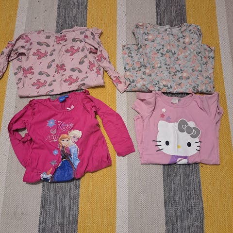 Tyttöjen iso vaatepaketti, koko 120-128. Olleet käytössä melko hoikalla tytöllä. T-paitoja, pitkähiaisia paitoja, yöpaita, farkkuja, leggareita. Viimeisessä kuvassa paitoja joissa pinttyneitä tahroja koska käytetty ulkoleikeissä ja liima-askarteluissa.