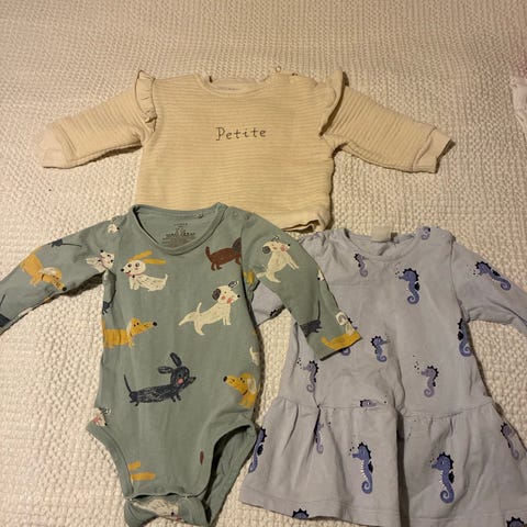Vaatesetti pienokaiselle, paita velouria (pehmeä pörröinen), koko 80. Napit takana, helppo pukea. Printti täydellinen. Ei moitteita.