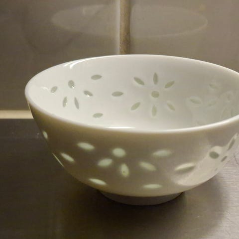 Kuusi kappaletta kiinalaista sinivalkeaa riisiposliinikulhoa sekä lusikat samaa kuosia. Hyväkuntoiset, ehjät. Kulhon korkeus 6 cm, leveys yläosan kohdalla 13,5 cm, vetoisuus n. 3 dl. Lusikan pituus 14 cm.