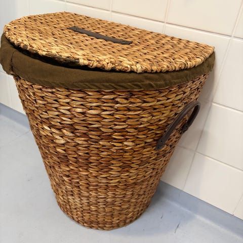 Aikoinaan Stockmannilta ostettu metallinen pyykkikori, puukansi.
