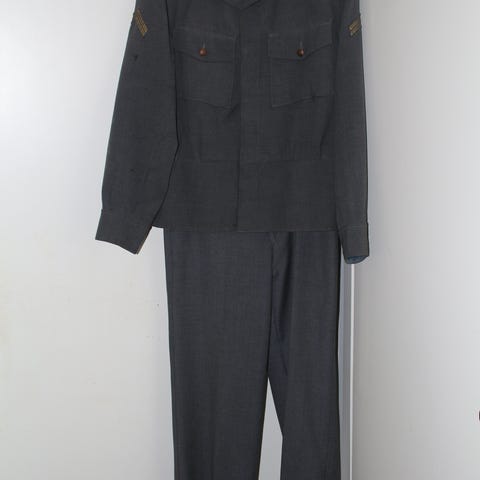 Hyvässä kunnossa oleva alikersantin sotilastakki ja housut, molemmat valtion pukutehtaan valmistamat.