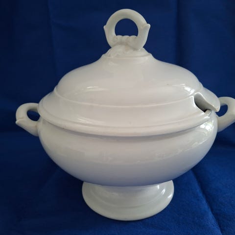 Vanha valkoinen tarjoilukulho Arabian piippuleimalla. Tuotantokausi leiman mukaan 1932-1949. Halkaisija yläreunassa 13 cm, korkeus 8 cm. Ehjä ja hyvässä kunnossa.