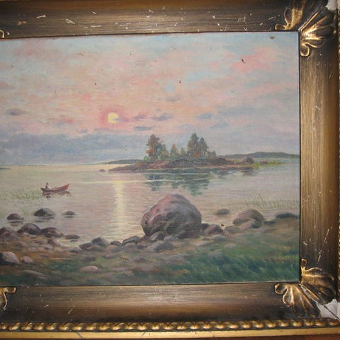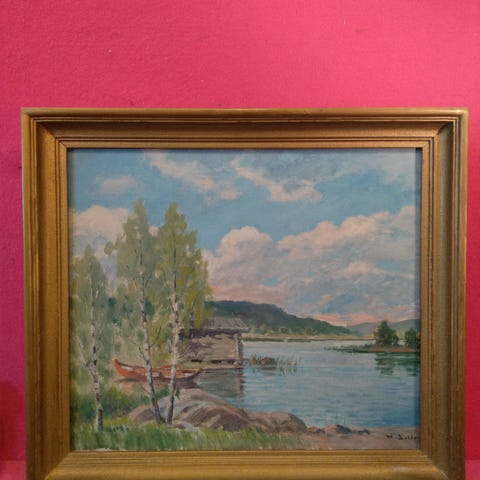 Öljyvärimaalaus, joka esittää perinteistä suomalaista maisemaa. Teos on kehystetty puisella kehyksellä.