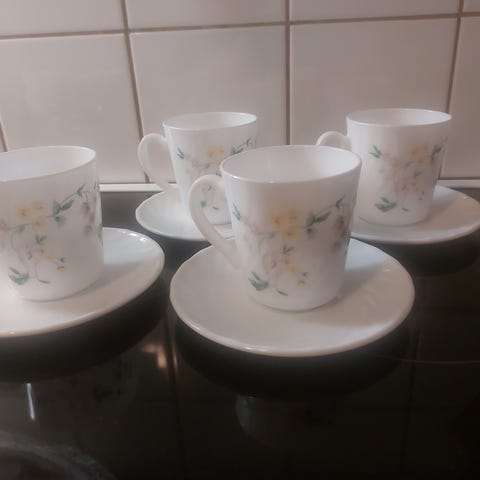 Ranskalainen Arcopal päivänkakkara tee astiasto. Nämä ovat todella kauniit! Pienet ja sirot! Ei mitään käytönjälkiä tai kulumaa. Kupin vetoisuus 0.75dl.