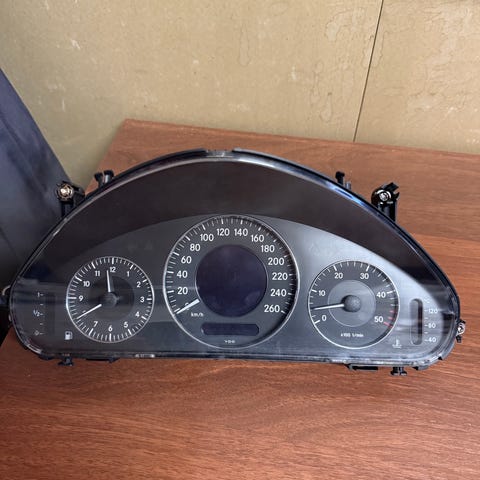Mercedes-Benz w211 mittaristo auton kojelauta, sisältää nopeusmittarin, kierroslukumittarin ja polttoainemittarin. Musta muovinen kotelo, sopii tiettyihin Mercedes-Benz automalleihin. Tarkat yhteensopivuustiedot tulee varmistaa ennen käyttöä.