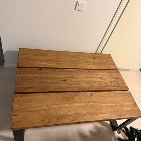 Juuri hiottu ja osmocolorin öljyvahalla kösitelty sohvapöytä. Liitokset vahvistettu