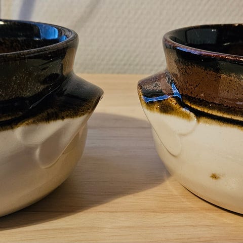 Kuusi Kermansaven Heinä-sarjan kulhoa; kaksi isompaa (n. 2,5 ja 3 litraa) ja neljä pienempää. Kulhot hieman erisävyisiä. Yhteishintaan 10€