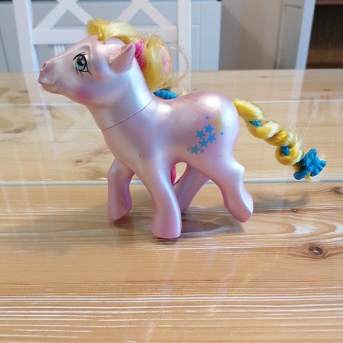 Hasbron My Little Pony G1-sukupolven Rosette-poni. Harjakset alkuperäisellä kiharalla, valitettavan kuivat harjakset. Pientä kulumaa takapuolen kuvioissa.