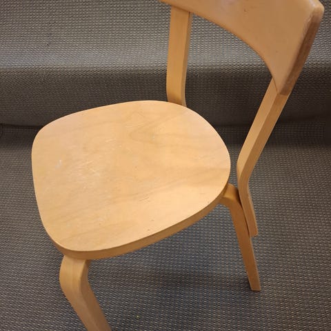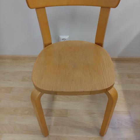Artek, Alvar Aalto, Huonekalutehdas Korhonen yhteistyön historiaa. Ruokapöytä ja 4 kappaletta tuoli 69 varhaista tuotantoa, työnjäljestä päätellen. Tuolit ovat ikäänsä nähden hyvässä ja alkuperäisessä kunnossa, pöytä huonommassa kunnossa ja sen pinta vaatii kunnostuksen. Pöydän alapuolella säilynyt mallipuusepän lyijykynällä tehdyt merkinnät kannen ja jalkojen väreistä. Olisiko mahdollisesti tehtaan yksi prototyypeistä? Historian havinaa siis on, tarjoukset sen mukaan. Varaan itselleni mahdollisuuden hyväksyä tai hylätä tarjouksen. Kuljetus saattaa hyvinkin järjestyä.