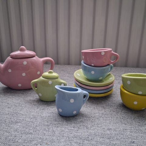 Pakkauksessa oleva lasten teeastiasto neljälle, lasitettua keramiikkaa. Käyttämätön. Astiasto on vanhahko, joten en tiedä, soveltuuko elintarvikekäyttöön. Pakkauksen koko 27 cm x 20 cm.