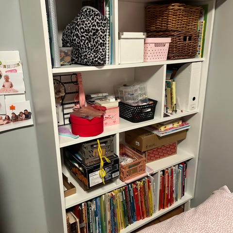 Mustat metallisnen runko ja hyllyt, sekä kolme lasista hyllyä. Kirjahyllyn saa paloiksi kulejtusta varten.