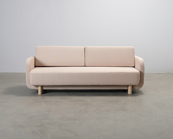 Tyylikäs 2,5-istuttava sohva, jonka pehmeät linjat, erinomainen istuinmukavuus ja muhkeat pehmusteet luovat sille kutsuvan ilmeen. Sohvan runko on verhoiltu beigellä nahalla ja istuintyynyissä on beige kangasverhoilu.