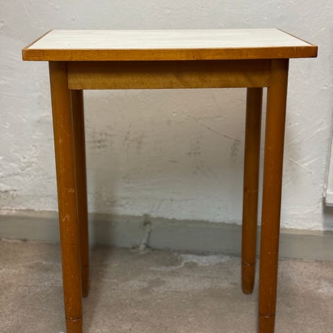 Alunperin sohvapöydästä tehty siro sivupöytä. Kansi oli sen verran kulahtanut, että hiljattain maalattu tyylikkään harmaaksi (ensin hiottu kevyesti). Jalat käsitelty sellakalla.
