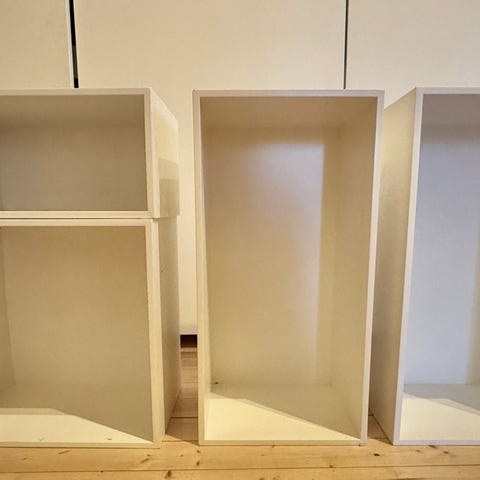 Myynnissä kaksi valkoista Muuton mini stacked hyllyä. Sopivat hyvin esim. yöpöydiksi seinään kiinnitettyinä. Pieniä käytön jälkiä, mutta yleisilme siisti. Hinta 30 euroa/kappale.