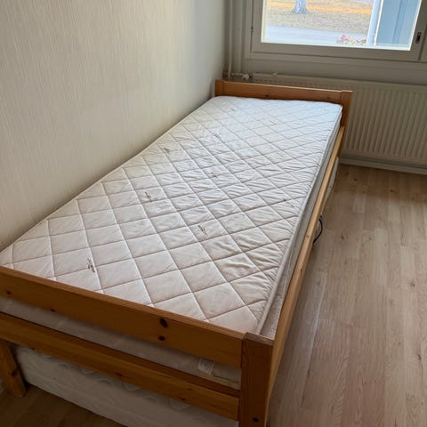 Myydään puinen runko patjalle. Sopii 90x120 patjalle.