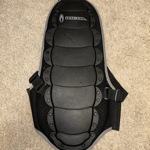 Lähes käyttämättömät panssarit selälle, vatsalle, olkapäille ja kyynär-käsivarsille. Soveltuu kelkkailuun ja moottoripyöräilyyn. Koko XXL. Selkä- ja kyynärvarsisuojukset on irrotettavat ja kiinnittyvät vetoketjuilla.