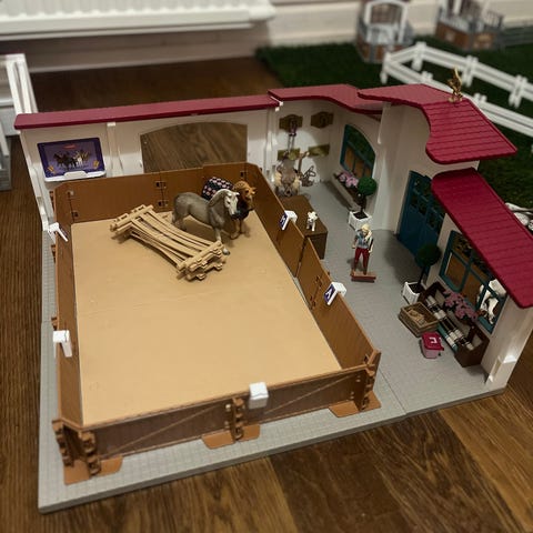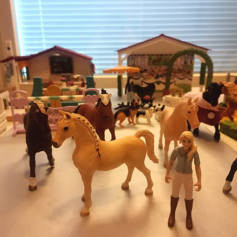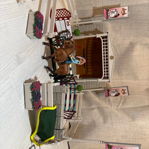 Schleich kilpailuareena, 4 hevosta, ratsastaja, hevosen hoitaja, 2 koiraa, 2 kissaa, ( ei ole schleichejä) aitaus ja muita tarvikkeita.