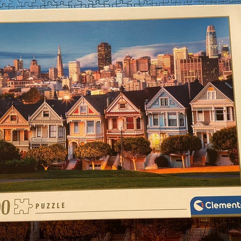 Vanha palapeli, jossa pahviset palat. Laatikko on hävinnyt, mutta mukana tulee valokuva kootusta palapelistä.