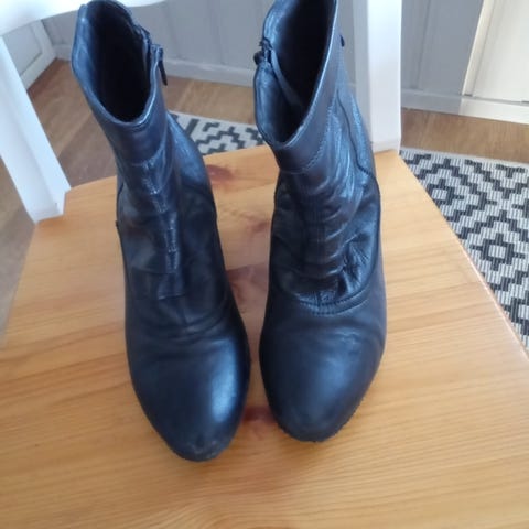 Mustat linjakkaat nilkkurit, koko 42. Leveä lesti. Kapeneva kiilakorko. Kerran käytetyt.