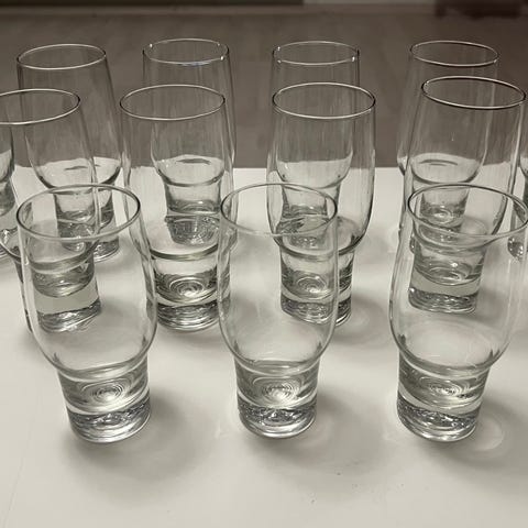 Ehjät, hyvä kuntoiset Tapio Wirkkalan Iittalalle suunnittelemat Mutteripohja juomalasit.Kork:12 cm, halkaisija 6 cm.