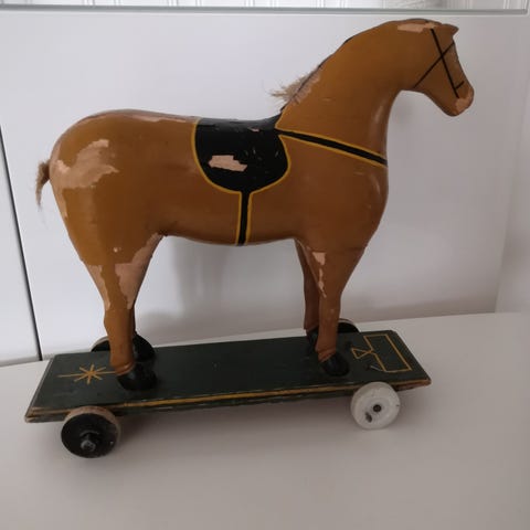 Ruskeassa ollut aikoinaan jalusta, josa pyörät/jalakset, kavioiden alla pienet liitostapit jalkojen alla - näistä voi liittää uuteen alustaan. Rintaremmi satula yms., varusteet on maalattu, harja ja häntä juuttia. Hevosen pintaan maalattuna pintakarva - taitavaa työtä! Asiaan kuuluvaa ja iän mukaista kulumaa - antiikkia 1800 l lopulta-1900l alku. Hinta 65 e.